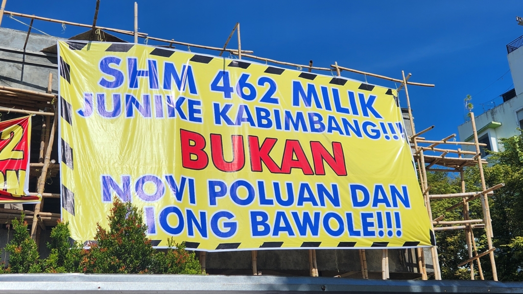 Sejak pagi, warga berdatangan dan membentuk barisan di sepanjang akses menuju lokasi. Baliho dan spanduk berbagai ukuran terpasang di pinggir jalan, menampilkan tulisan seperti “SHM 462 Milik Junike Kabimbang”, “Jangan Sentuh Tanah Ini!”, hingga “Eksekusi Ini Kekeliruan Hukum”. Atribut tersebut menjadi simbol penolakan terhadap eksekusi yang dinilai warga berpotensi merampas hak mereka sebagai pemilik sah.